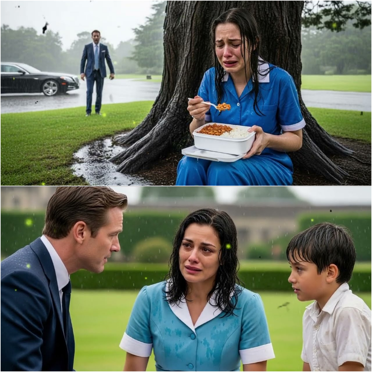 It was his maid. Her hair was plastered to her scalp, and she was shivering, trying to shield a small plastic container with her body as she ate. The rain mixed with the steam rising from her simple meal, and for a moment, Arthur thought it was mixing with tears, too. She didn’t move, didn’t seek the shelter of the covered porch just fifty feet away. She just sat there, enduring the cold, looking like a woman who had long forgotten what comfort felt like.