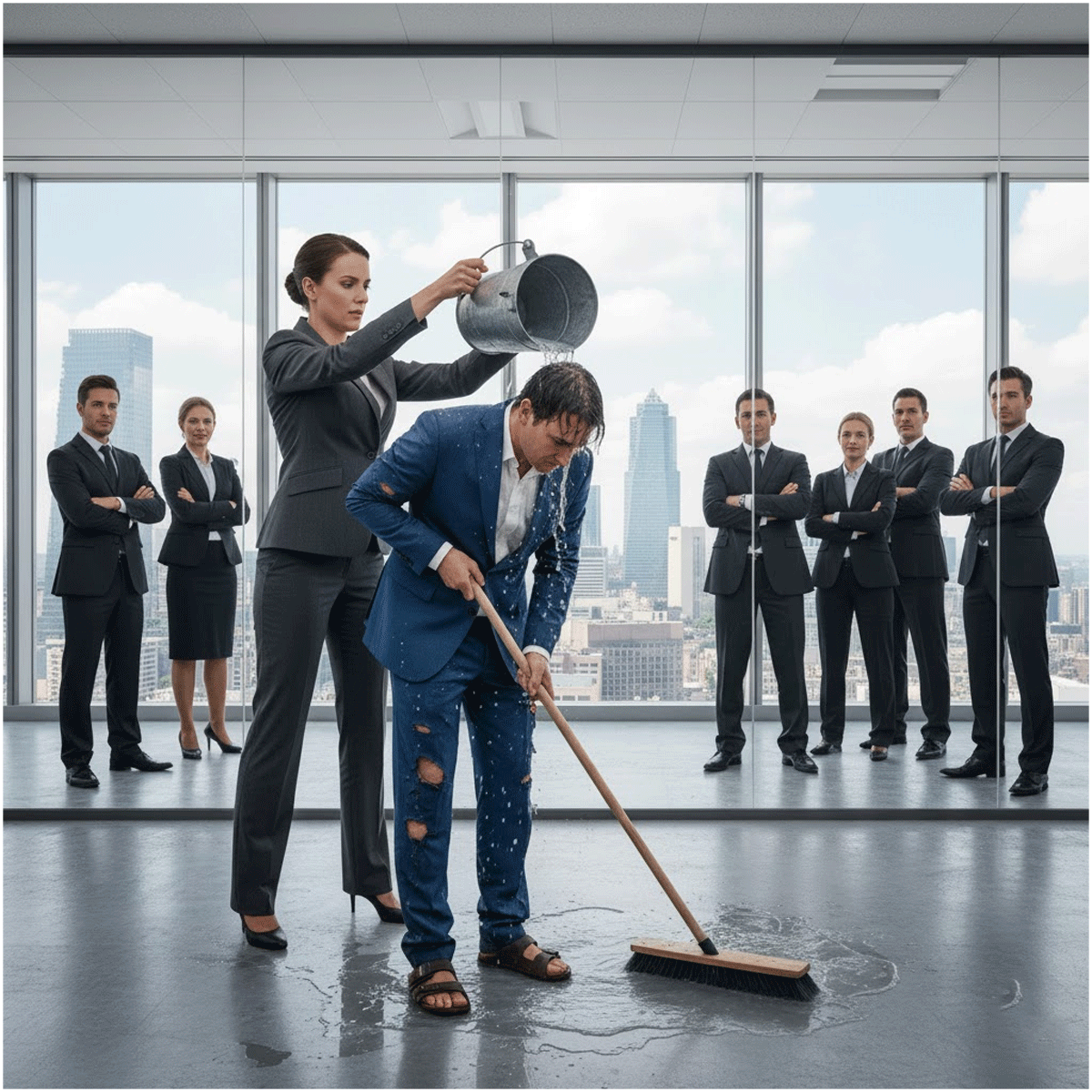 Ice-cold water soaked his hair and clothes, dripping to the floor and forming a puddle around his worn shoes. A deafening silence fell over the office. More than twenty employees stared, their faces a canvas of shock, horror, and a deep, unspoken anger. They were too afraid of becoming her next target to intervene.